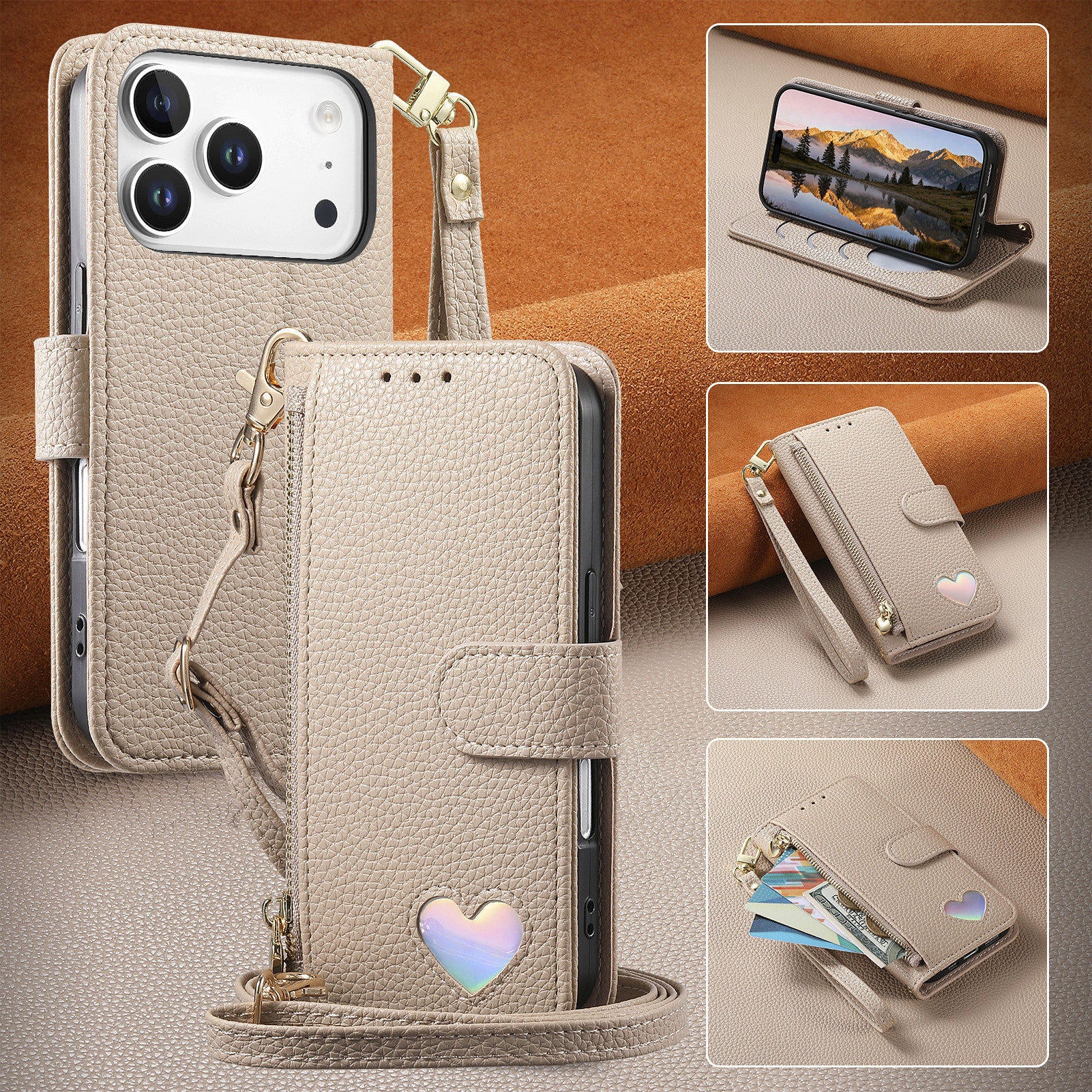 New Love Crossbody Zipper Wallet Leather Phone Case for iPhone 17 Pro Max